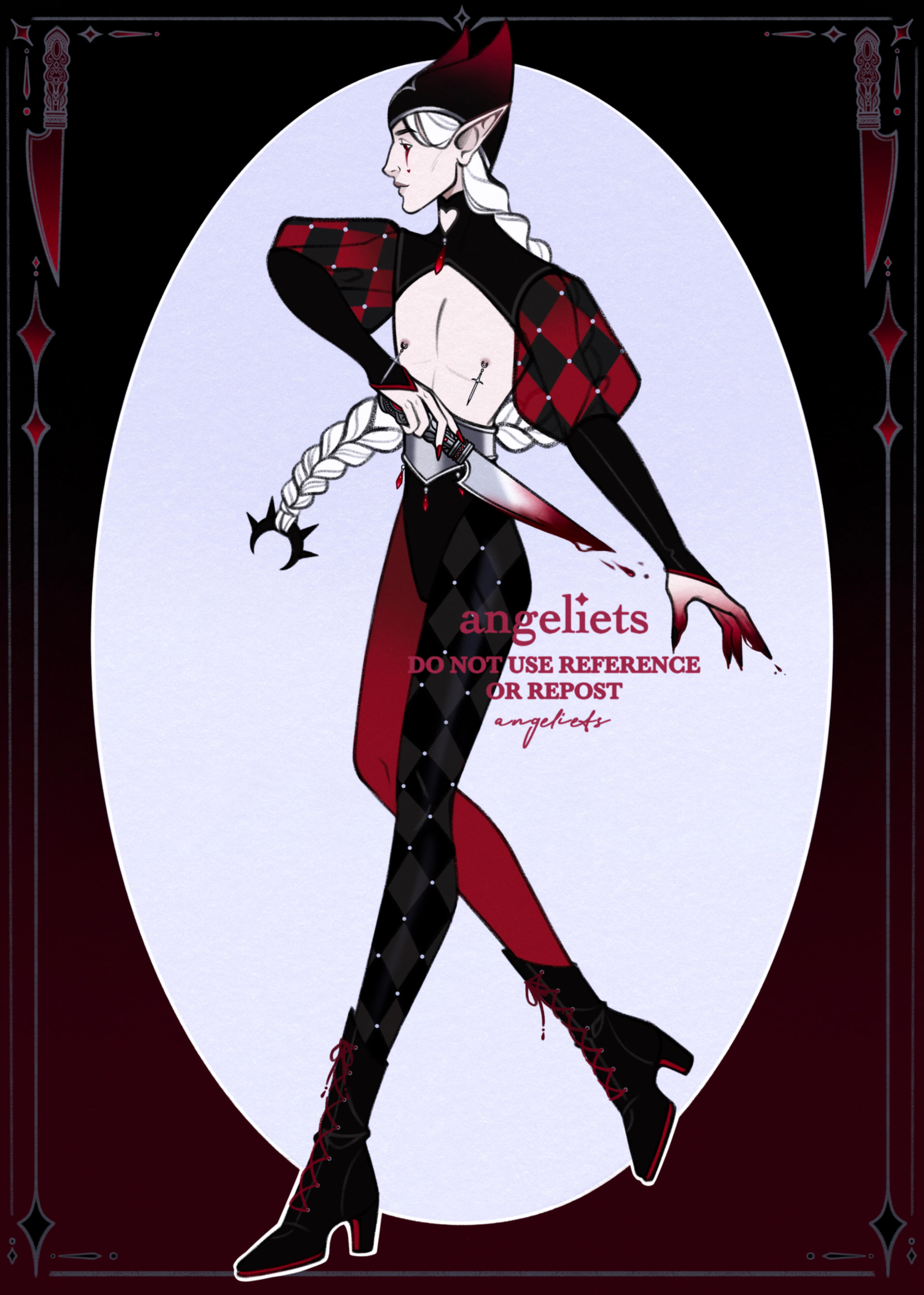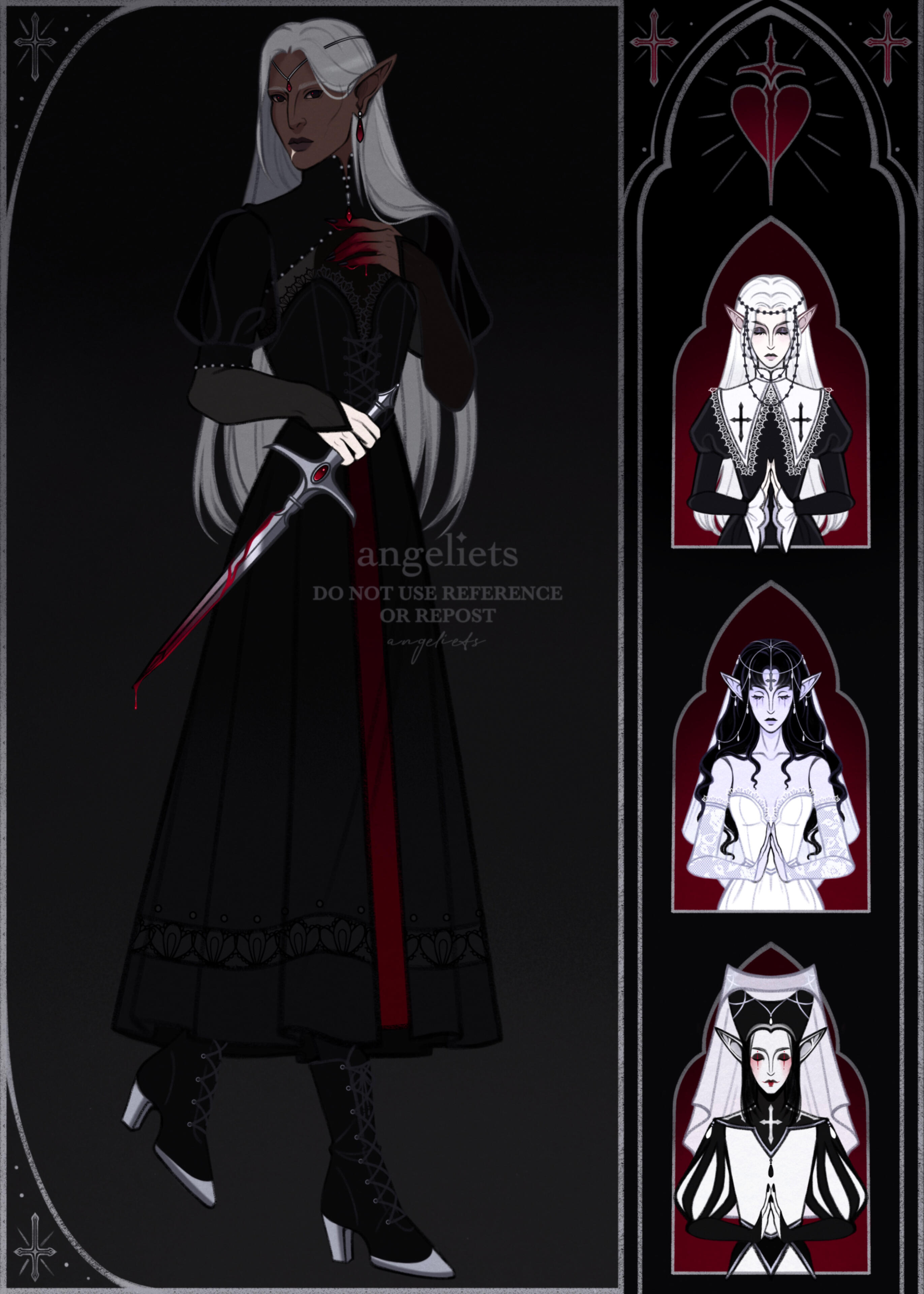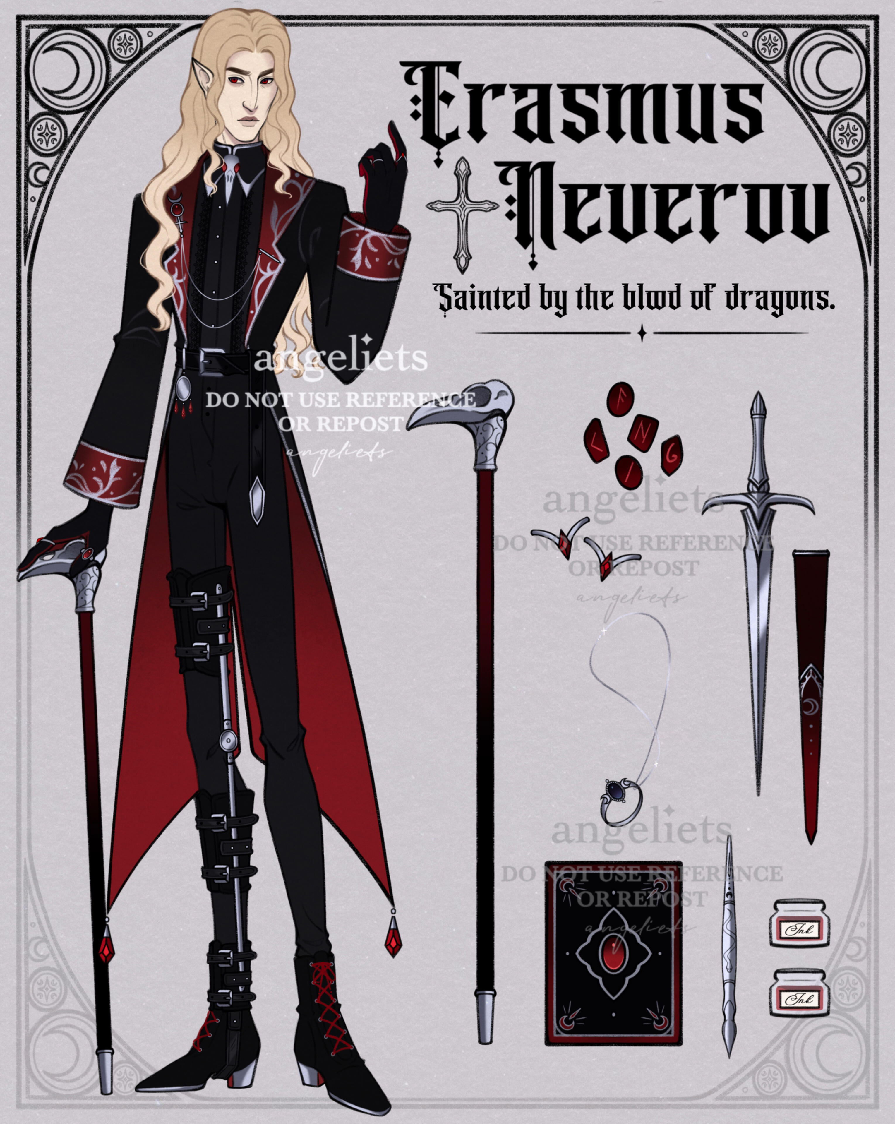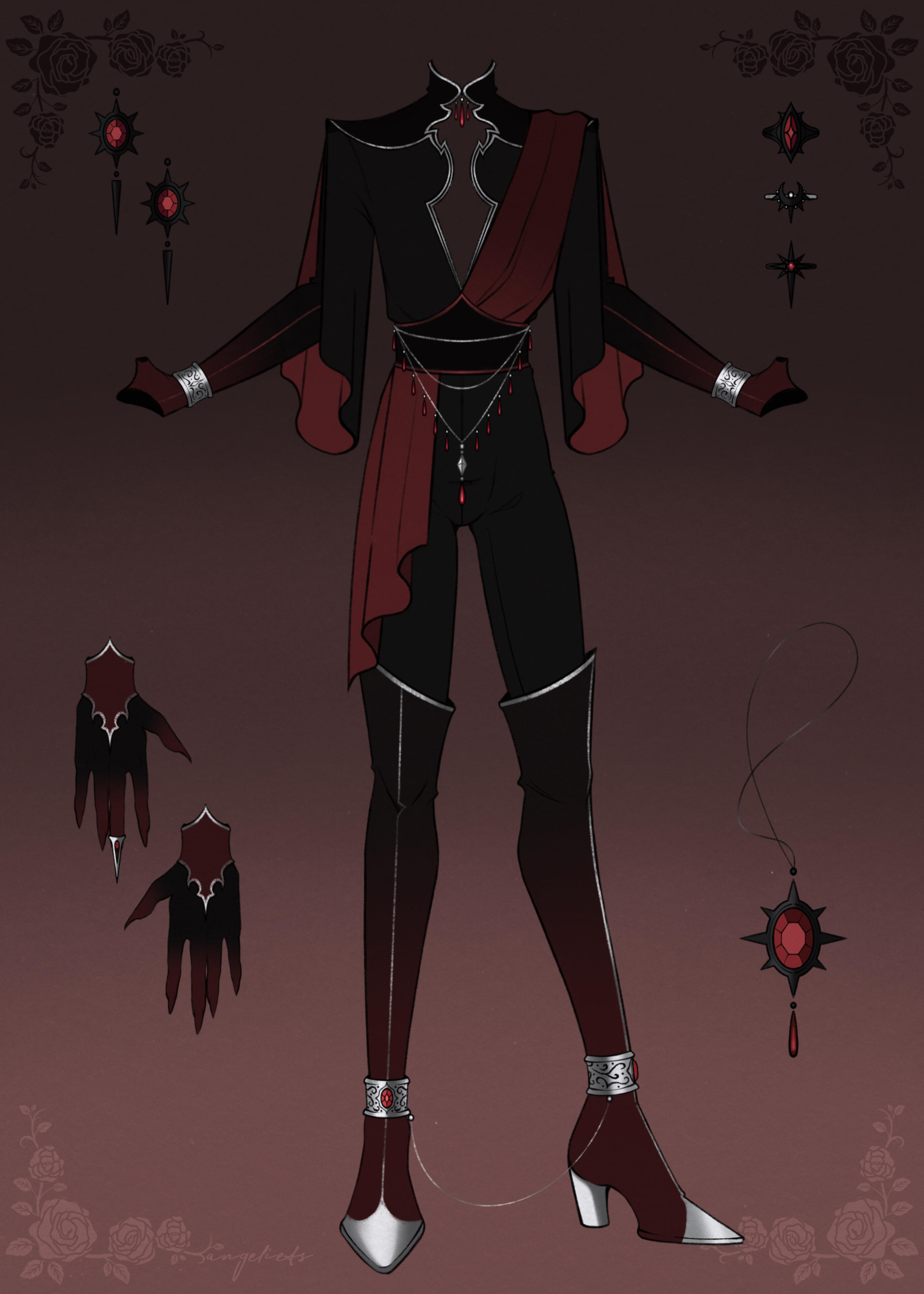 The starting rate for all commissions is 500 USD.I accept characters or projects that are of the dark, medieval, or gothic fantasy genres only.Listed below are the commission styles I offer. ]{#8F0707}✦Outfit Design